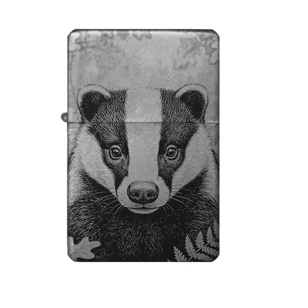 Ein beeindruckendes Porträt für Liebhaber heimischer Wildtiere: Dieses Benzinfeuerzeug zeigt den Kopf eines Dachses in beeindruckender Detailtiefe. Die markante Zeichnung des Gesichts wird durch die hochwertige Lasergravur auf dem matt-schwarzen Metallgehäuse perfekt in Szene gesetzt. Umrahmt von dezenten Wald-Elementen wie Farnen und Eichenblättern, ist dieses Feuerzeug ein ausdrucksstarkes Statement für Naturverbundenheit.