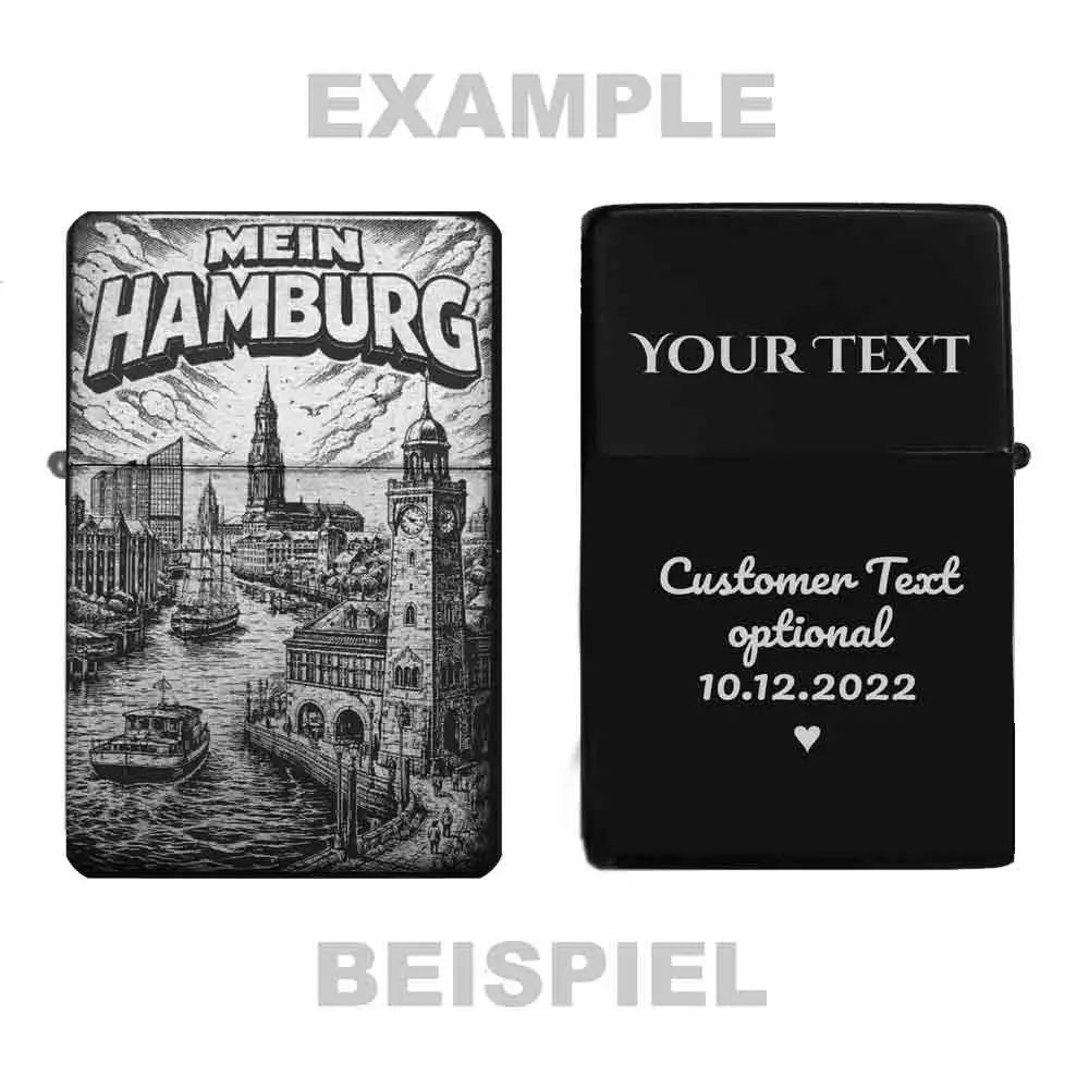 Dieses schöne Benzinfeuerzeug besticht durch sein maritimes Städte-Design. Das Motiv zeigt die Hamburger Wahrzeichen Landungsbrücken und Michel sowie Hafen-Szenen mit Schiffen. Die präzise Lasergravur sorgt für ein langlebiges Bild auf der matt-schwarzen Metalloberfläche. Ein ideales Accessoire für alle, die eine Verbindung zur Hansestadt Hamburg und der Elbe suchen.