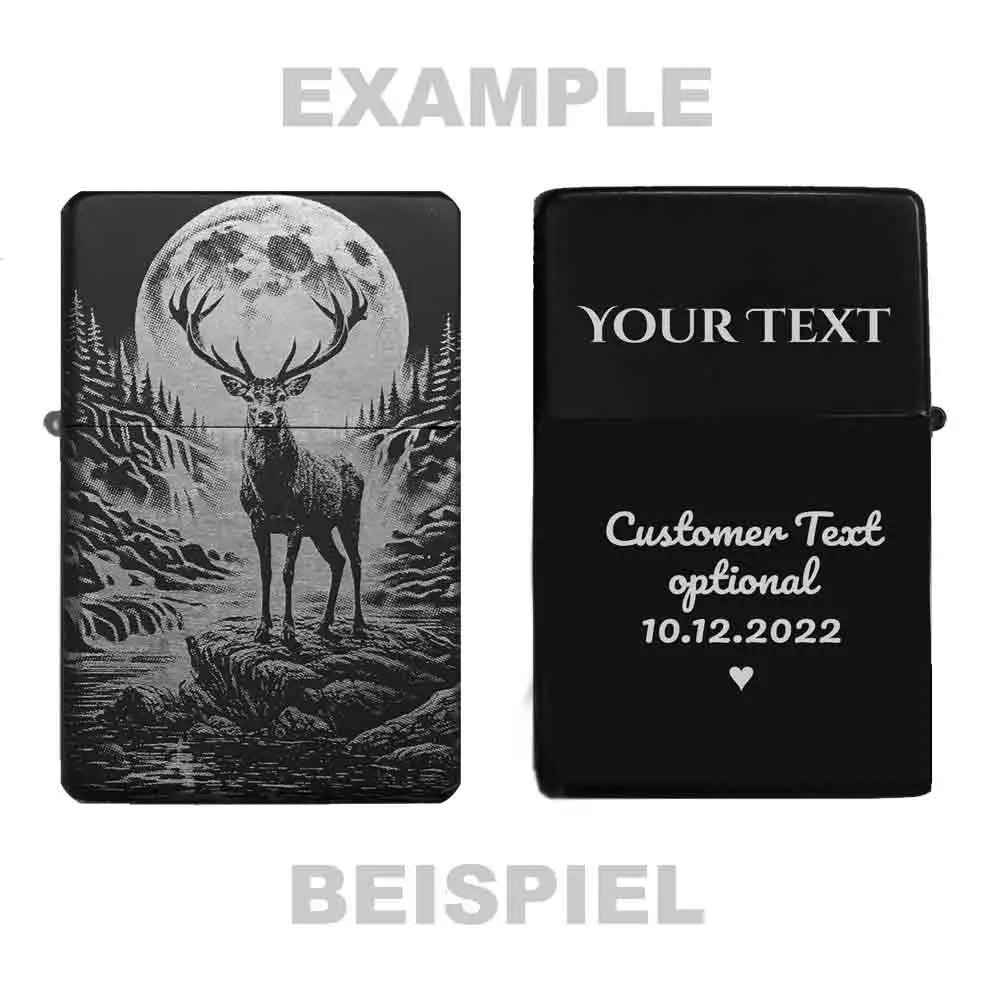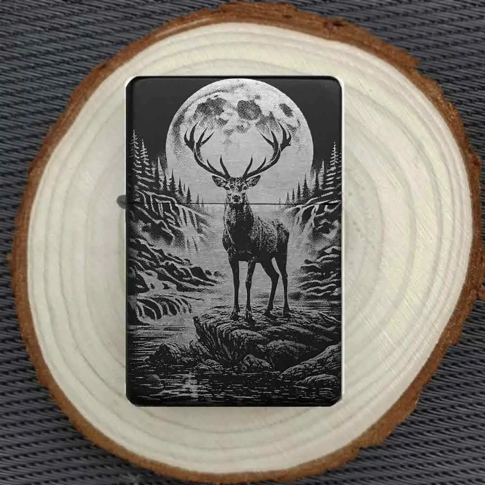 Dieses schöne Benzinfeuerzeug besticht durch sein atmosphärisches Natur-Design. Das Motiv zeigt einen Hirsch auf einem Felsvorsprung vor einem großen Vollmond, umgeben von Wasserfällen und einer dichten Waldlandschaft. Die präzise Lasergravur sorgt für ein langlebiges Bild auf der matt-schwarzen Metalloberfläche. Ein ideales Accessoire für alle, die eine Verbindung zur Natur und der Symbolik des Hirsches suchen.