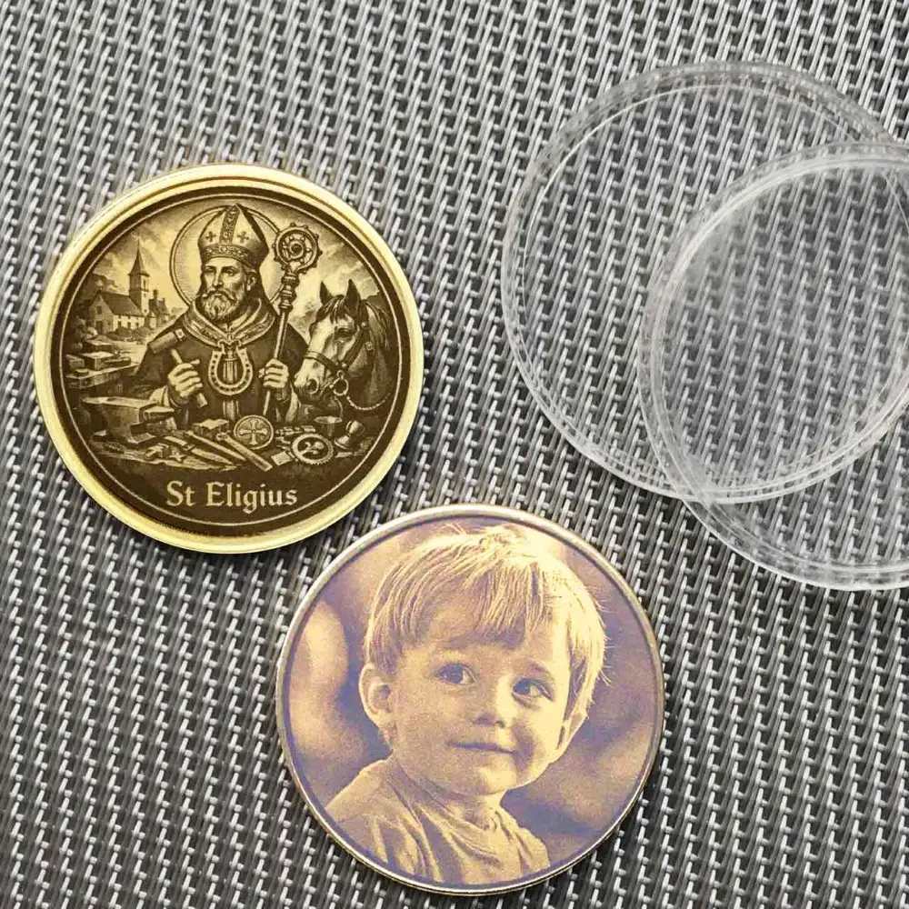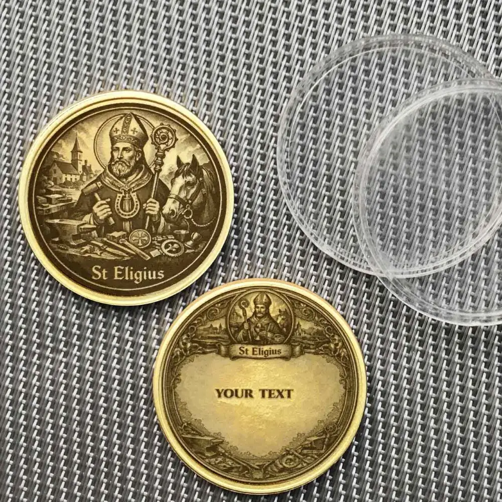 Eligius gilt als der Schutzpatron aller, die Metall bearbeiten, sowie der Pferde. Für Hufschmiede, Kunstschmiede, Schlosser und Metallbauer bieten wir diese personalisierbare Schutzmünze an. Auf der Vorderseite ist der Heilige mit Hammer, Hufeisen und Amboss abgebildet. Die Rückseite gehört dir: Wähle zwischen einer Textgravur, die stilvoll von einem Rahmen mit Zunft-Werkzeugen eingefasst wird, oder einer vollflächigen Fotogravur. Ein langlebiger Talisman aus massivem Messing.