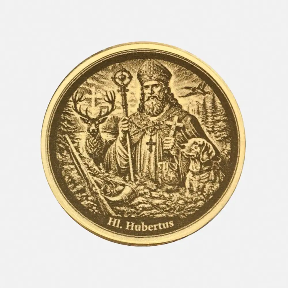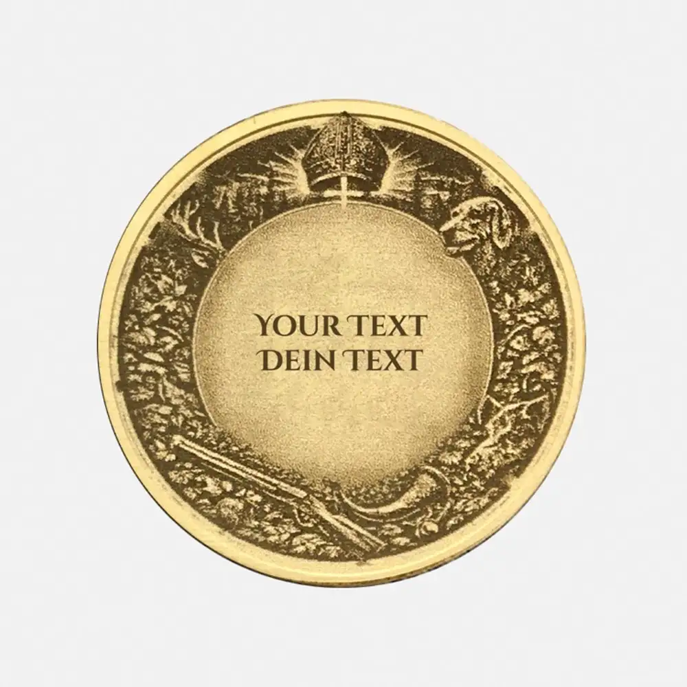 Die Legende des Heiligen Hubertus mahnt zur Achtung vor der Kreatur und ist tief im Brauchtum der Jagd verwurzelt. Für alle Jäger und Naturschützer bieten wir hier ein personalisierbares Highlight an. Auf der Vorderseite prangt der Heilige mit dem Hirsch, der das Kruzifix im Geweih trägt. Die Rückseite gehört dir: Wähle zwischen einer Textgravur, die stilvoll von Eichenlaub, Bischofsmütze und Jagd-Utensilien umrahmt wird, oder einer vollflächigen Fotogravur. Perfekt als Talisman oder Ehrenzeichen.