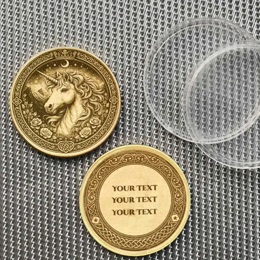 Die Vorderseite – Das Einhorn: Die gelaserte Grafik zeigt das Einhorn. Es steht für Schutz, Magie und die Unschuld des Herzens.
