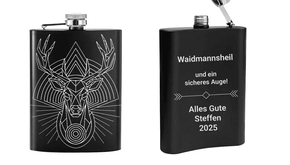 - Individueller Textgravur: Ob Namen, ein besonderes Datum, ein Zitat oder ein Jagdspruch – bis zu 4 Zeilen Text sind möglich, um dem Flachmann eine ganz persönliche Note zu verleihen.