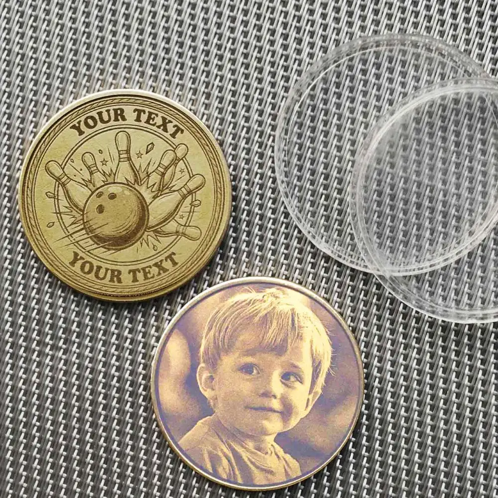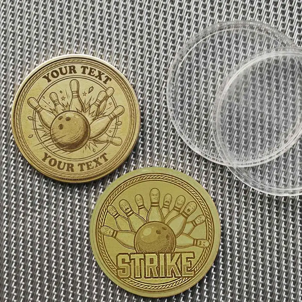 ✓ Beschreibung: Die Bowling-Münze zeigt vorne eine dynamische Wurf-Szene, umrandet von Deinem Text. Die Rückseite zeigt standardmäßig „STRIKE“ vor Pins, optional Dein eigenes Bild.