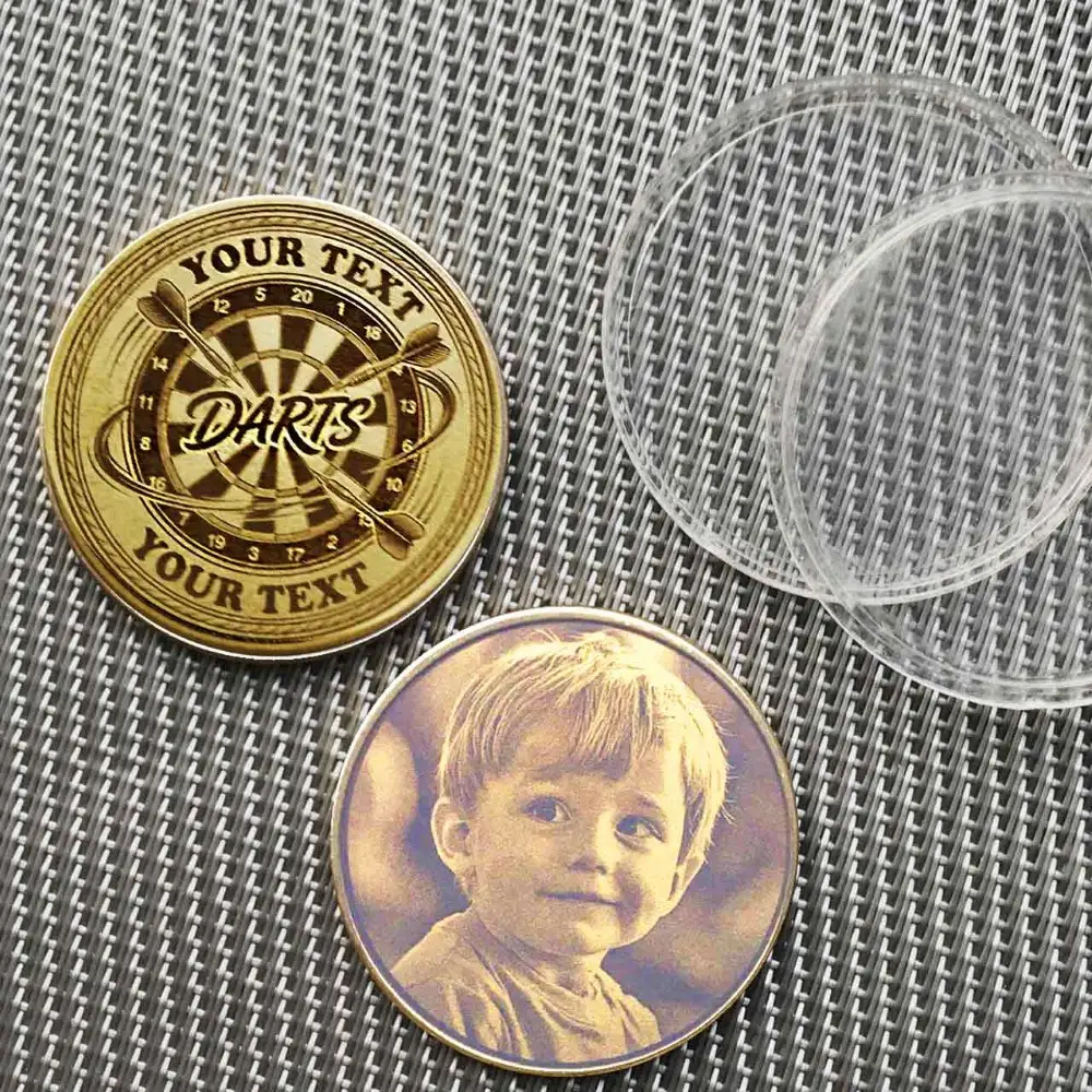 ✓ Beschreibung: Vorderseite mit Dart-Logo und zwei Textfeldern (oben/unten). Rückseite standardmäßig mit Dartboard-Motiv, optional durch eigenes Foto austauschbar.