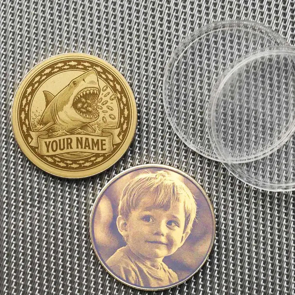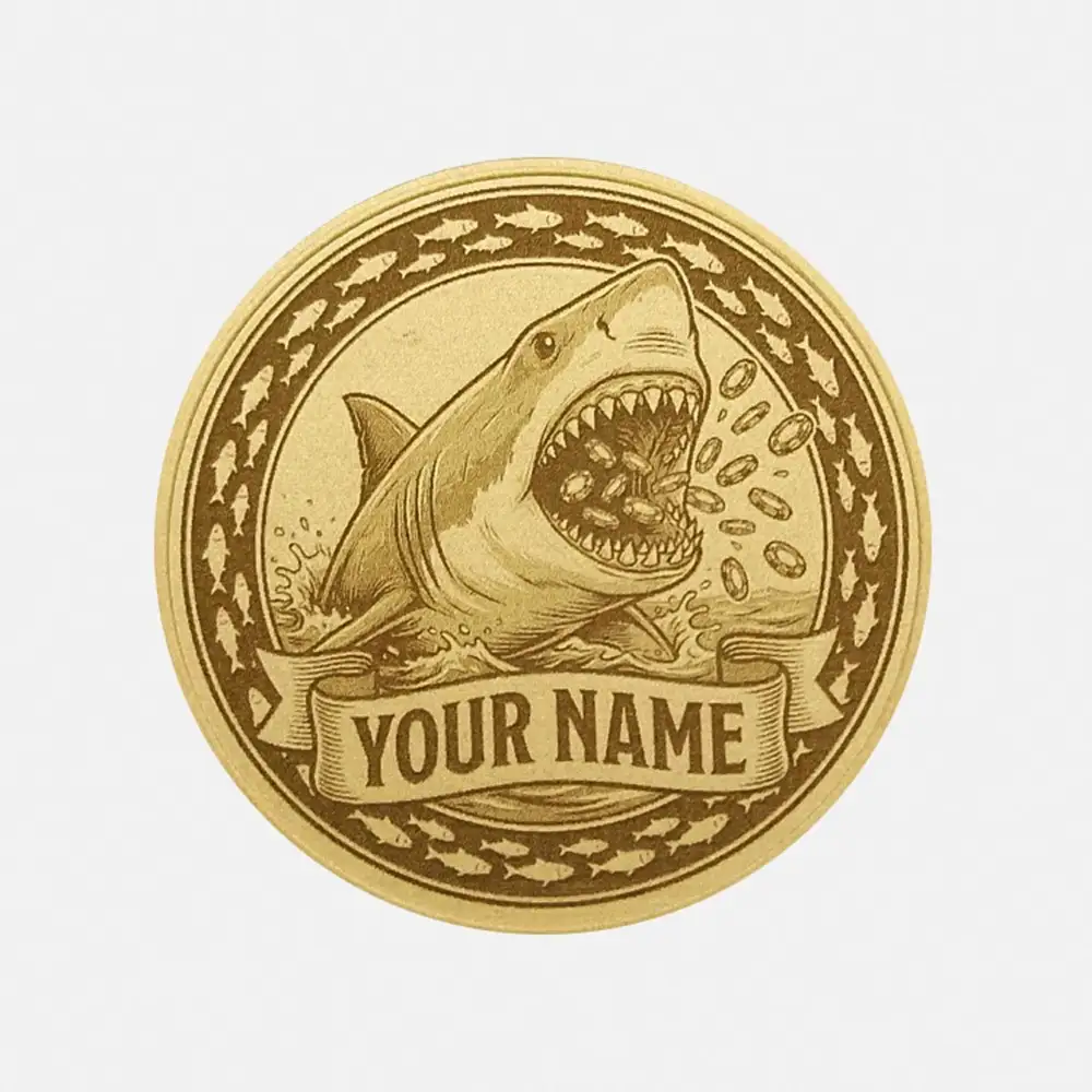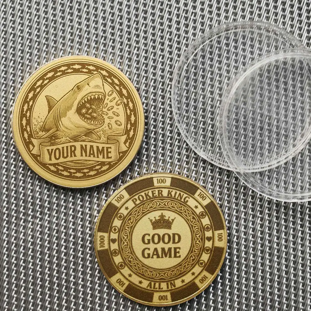 ✓ Beschreibung: Die Vorderseite zeigt einen Hai, der nach Pokerchips schnappt, mit einem personalisierbaren Namensbanner am unteren Rand. Die Rückseite zeigt standardmäßig ein Casino-Chip-Design („Poker King“), optional ist eine Fotogravur möglich.