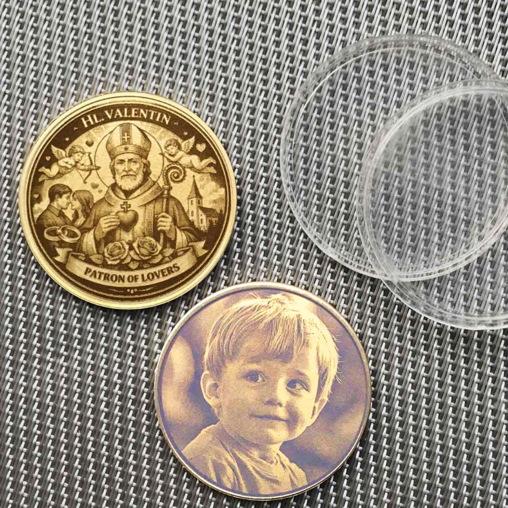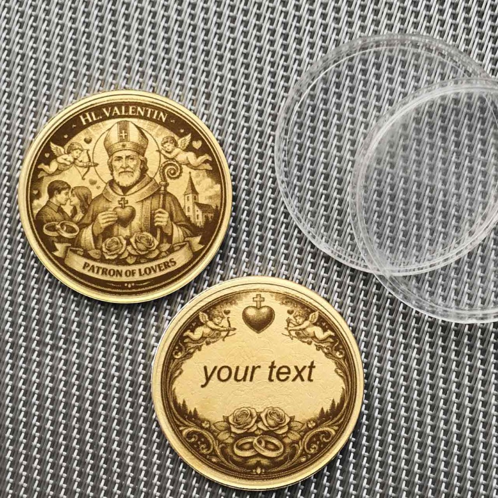 Es gibt Geschenke, die berühren das Herz. Unsere St. Valentin Schutzmünze gehört dazu. Für alle, die ihre Liebe unter einen besonderen Stern stellen wollen, bieten wir dieses personalisierbare Highlight an. Auf der Vorderseite segnet der Heilige Valentin den Bund der Liebe. Die Rückseite gehört dir: Wähle zwischen einer Textgravur, die stilvoll von Ringen, Rosen und Engeln umrahmt wird, oder einer vollflächigen Fotogravur. Ein langlebiger Glücksbringer aus massivem Messing.