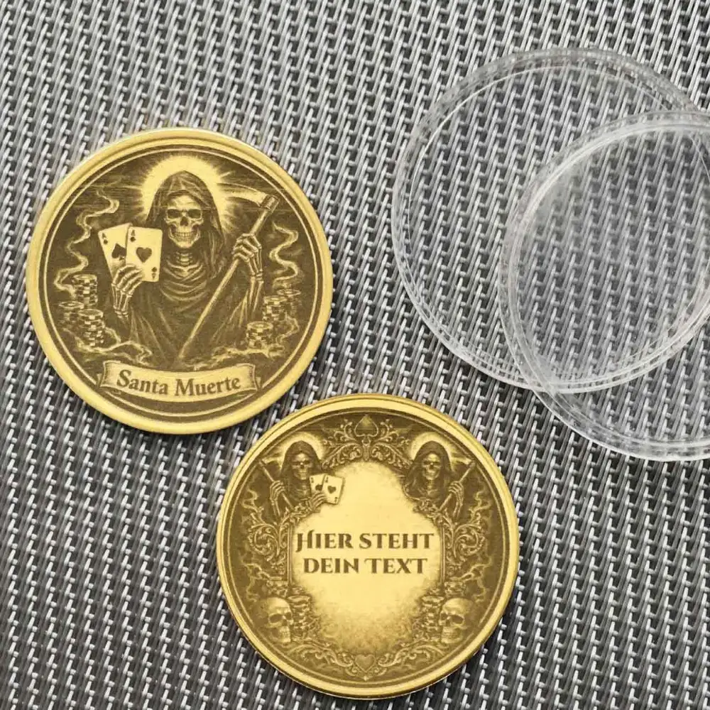 Die Santa Muerte ist eine Figur voller Kontraste: Gefürchtet und geliebt, Symbol des Todes und Beschützerin des Lebens. In dieser speziellen Darstellung mit Spielkarten und Chips fungiert sie als Herrin des Schicksals und Glücksbringerin. Für alle, die das Außergewöhnliche suchen, bieten wir diese personalisierbare Münze an. Auf der Vorderseite ist sie mit Sense und Poker-Attributen abgebildet. Die Rückseite gehört dir: Wähle zwischen einer Textgravur, die von einem Rahmen mit Sensenmännern und Karten eingefasst wird, oder einer vollflächigen Fotogravur. Ein langlebiger Talisman aus massivem Messing.
