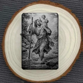 Dieses robuste Benzinfeuerzeug ehrt den Heiligen Christopherus, den weithin verehrten Schutzpatron der Reisenden, Autofahrer und Seefahrer. Das Motiv zeigt die traditionelle Darstellung des Heiligen mit dem Jesuskind auf den Schultern, während er sicher das Wasser durchquert. Die hochwertige Lasergravur sorgt für ein langlebiges und detailreiches Design auf der matt-schwarzen Oberfläche.
