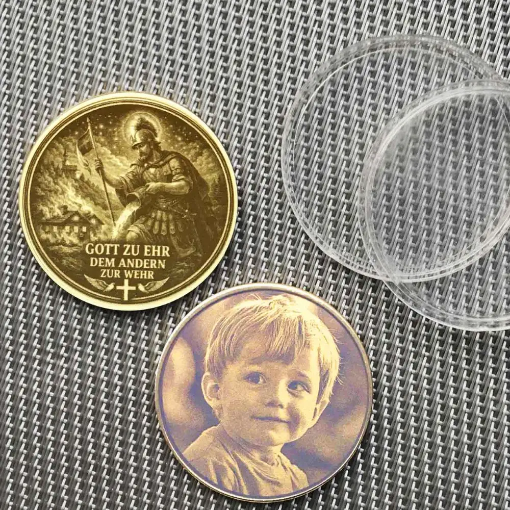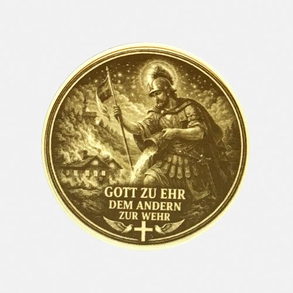 Feuerwehr ist mehr als ein Hobby, es ist eine Leidenschaft. Genau dafür steht diese schwere Münze aus massivem Messing. Sie trägt stolz den Leitspruch „Gott zu Ehr dem andern zur Wehr“. Doch erst deine individuelle Anpassung macht sie perfekt: Wir gravieren Namen, Widmungen oder sogar ein Foto präzise auf die Rückseite. So wird aus dem Schutzpatron St. Florian ein ganz persönlicher Glücksbringer, der die Verbundenheit zur Feuerwehr für immer festhält.