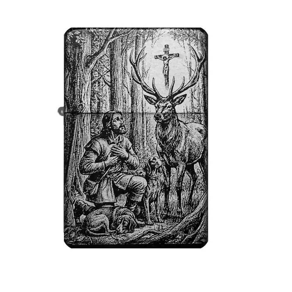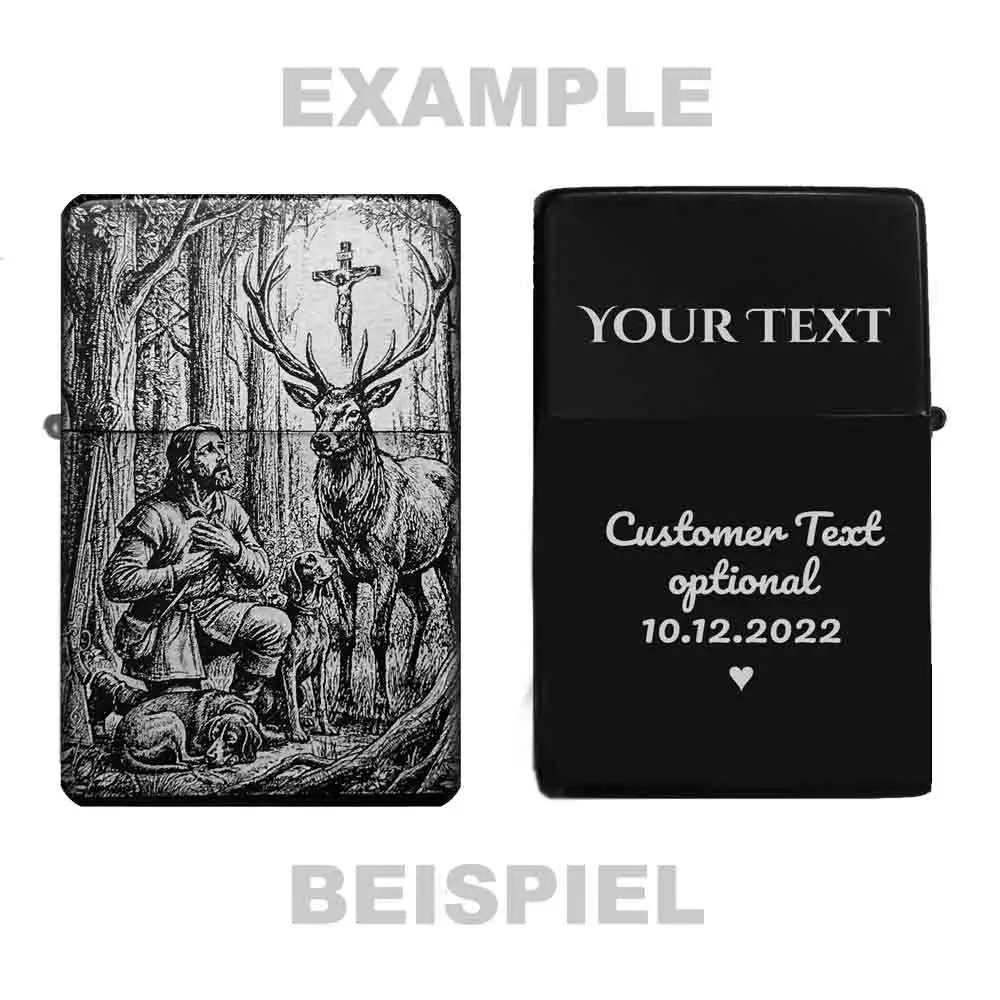 Dieses robuste Benzinfeuerzeug ehrt den Heiligen Hubertus, den Schutzpatron der Jäger, Schützen und Metallarbeiter. Das Motiv zeigt die klassische Erscheinung des Hirsches mit dem Kruzifix, die Hubertus zur Umkehr und zur Achtung vor dem Leben bewegte. Die hochwertige Lasergravur sorgt für ein langlebiges und detailreiches Design auf der matt-schwarzen Oberfläche, das auch im rauen Outdoor-Einsatz Bestand hat.