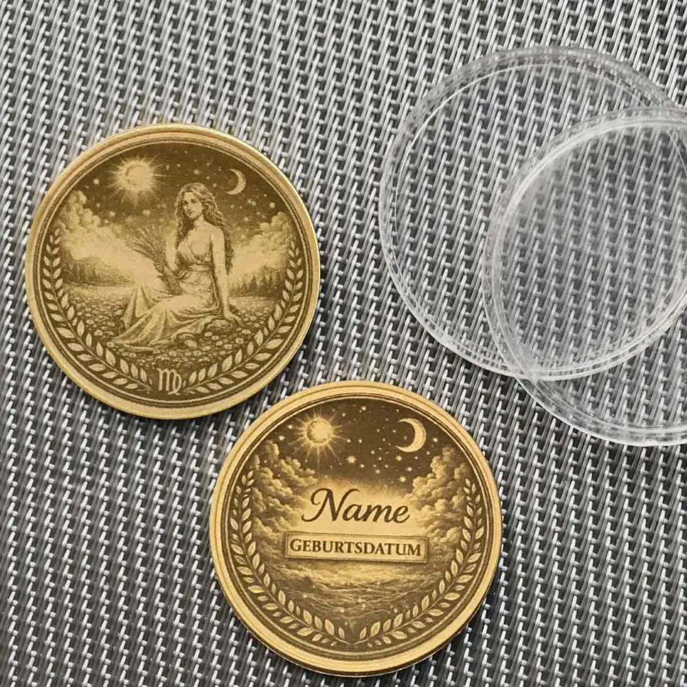 Geburtstagsgeschenke gibt es viele, aber diese Münze bleibt. Für alle, die im Zeichen der Jungfrau (24. August – 23. September) geboren sind, bieten wir hier ein personalisierbares Highlight an. Auf der Vorderseite prangt das kunstvolle Jungfrau-Motiv mit Ähre, Sonne und Mond. Die Rückseite gehört dir: Wähle zwischen einer Textgravur mit Namen und Geburtsdatum oder einer vollflächigen Fotogravur. Perfekt als Talisman oder edles Sammlerstück.