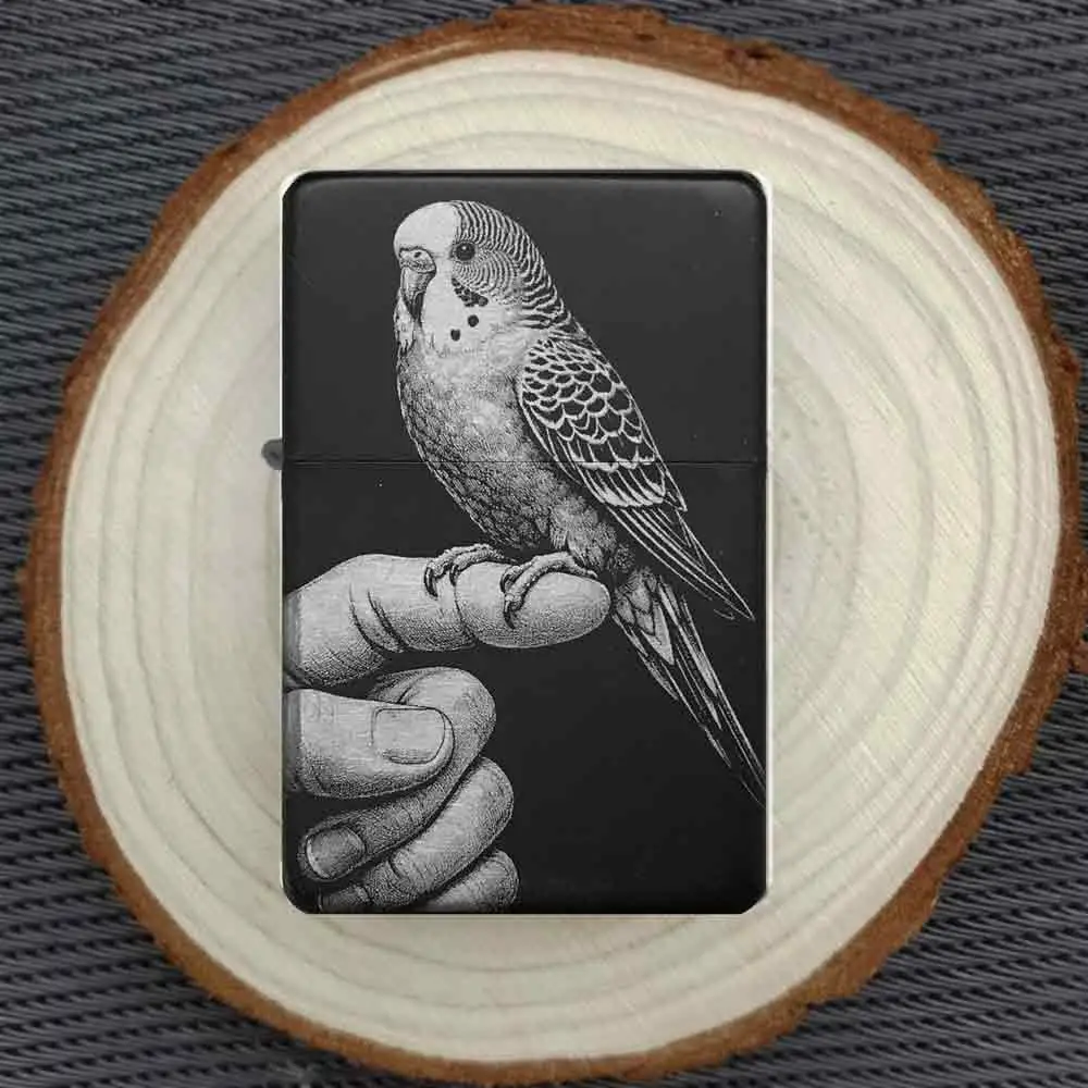 Dieses schöne schwarze Feuerzeug besticht durch sein detailreiches Haustier-Design. Das Motiv zeigt einen Wellensittich, der auf einem Finger sitzt, was die Zahmheit und den Charakter dieser beliebten Ziervögel unterstreicht. Die präzise Lasergravur sorgt für ein langlebiges Bild auf der matt-schwarzen Metalloberfläche. Ein ideales Accessoire für alle, die eine enge Verbindung zu ihren Vögeln pflegen.